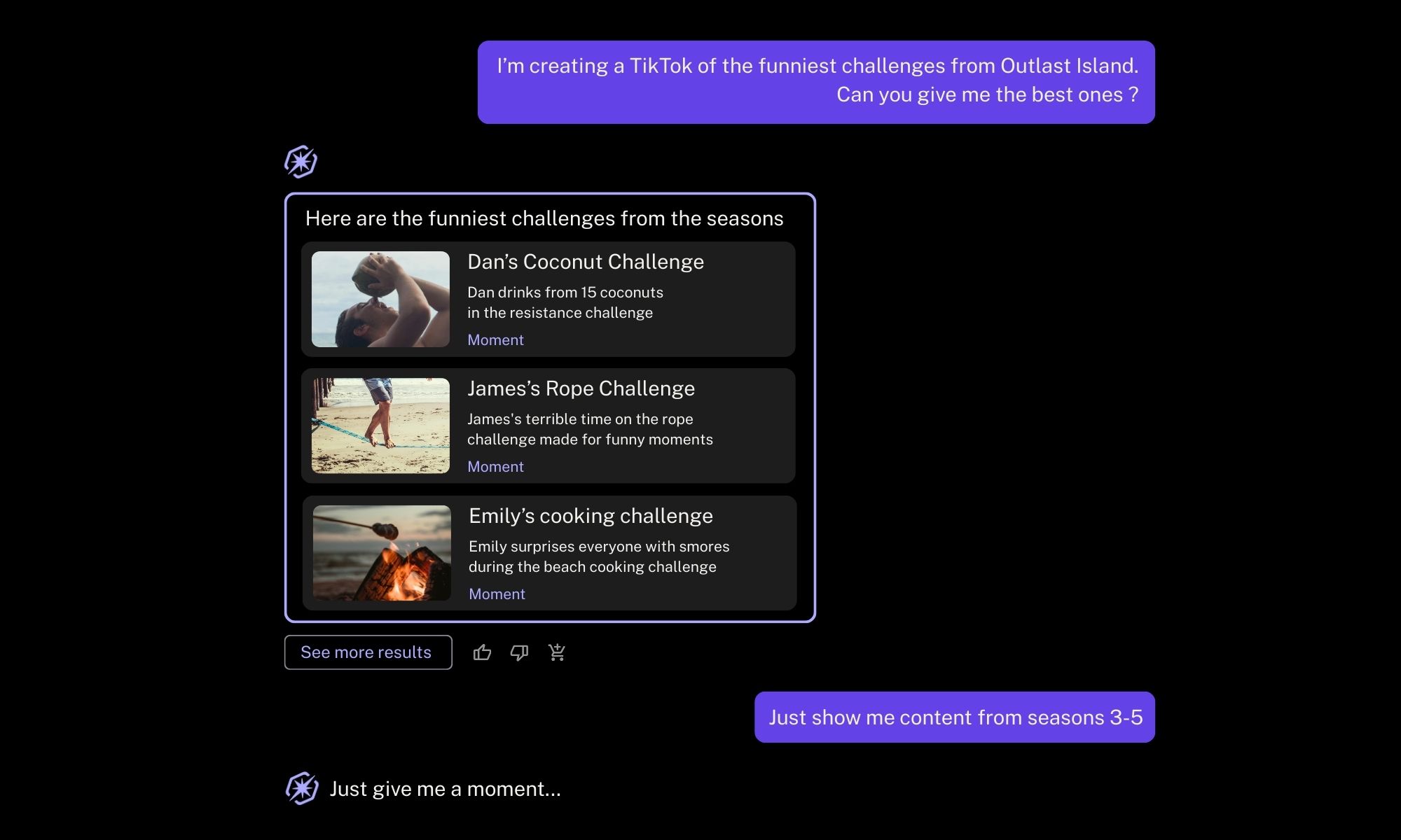 Be clear about the format or type of moment you’re after. The Discovery Agent can return a sequence, a shot, a soundbite or even full videos—but it helps to be specific.